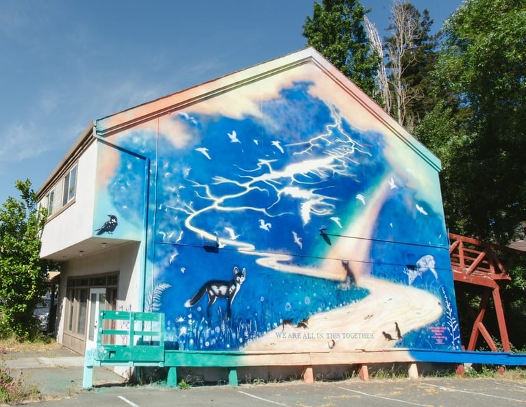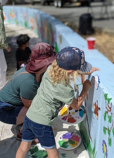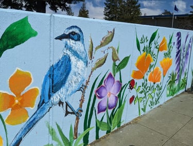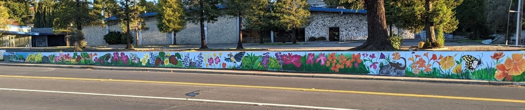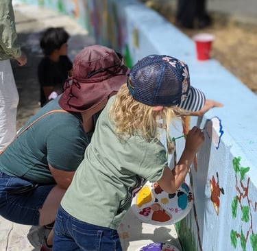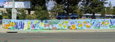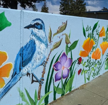 We are excited to celebrate El Sobrante's newest mural! Triangle Works worked with El Sobrante artist Yulia Pinkusevich to bring her vision to reality. Yulia's design is inspired by our local watershed and its inhabitants. The mural site is located at 4927 Appian Way, adjacent to Appian Creek. The mural was painted in May 2025.