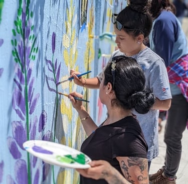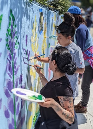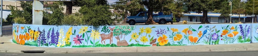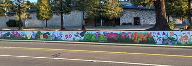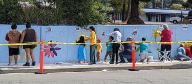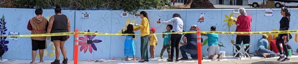 Over 2 weekends in Summer 2023, El Sobrante artist, Hayley Ferreria, with the help of artist assistants and dozens of volunteers of all ages, led the community in painting the 280 foot long wall along Appian Way and Fran Way. Thank you to the almost 100 community members who came out to paint and celebrate your mural!